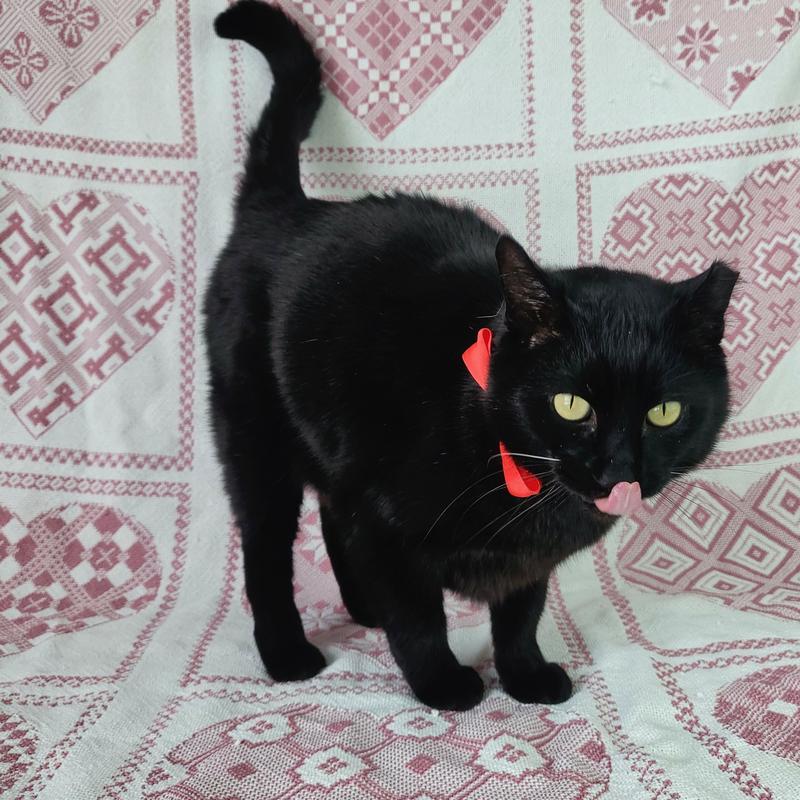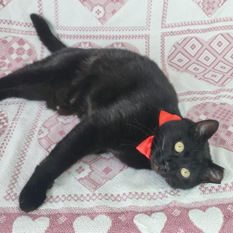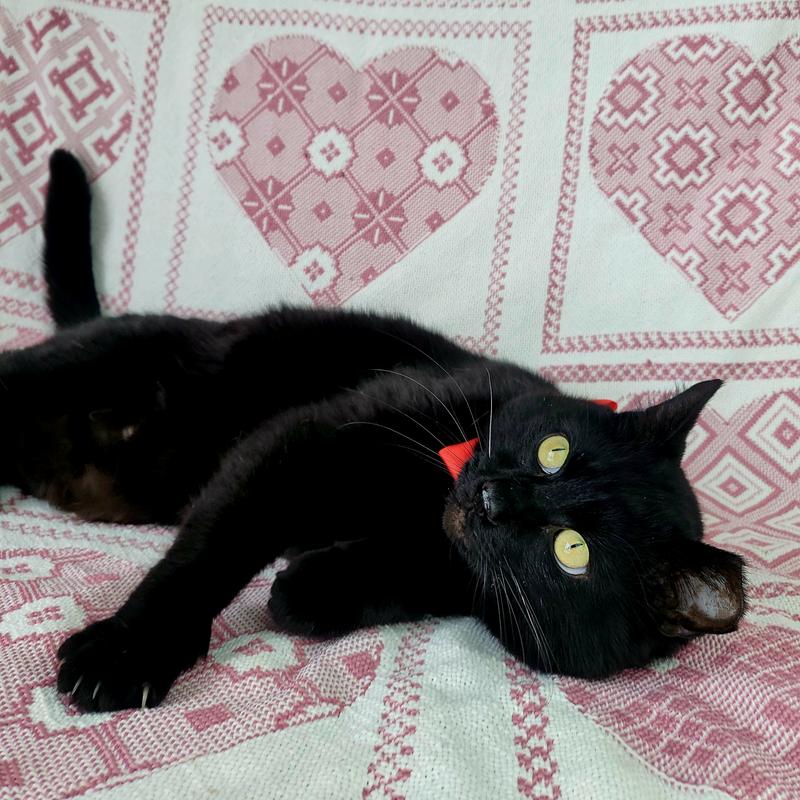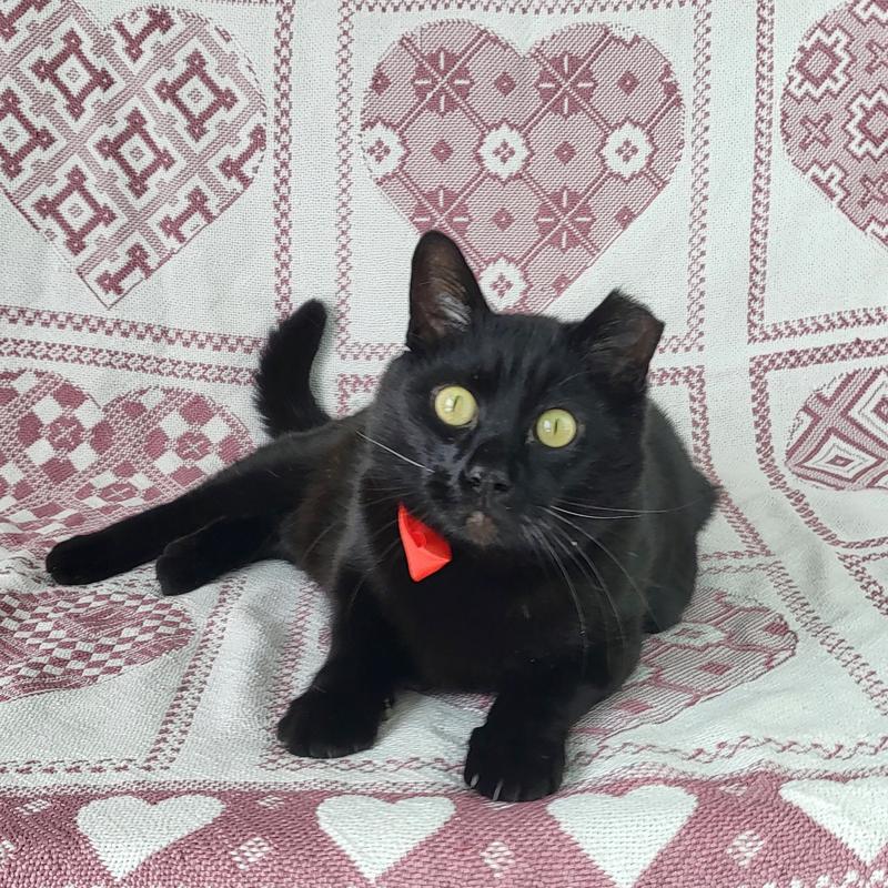 This Gorgeous Hunk is Obsidian, a magnificent four-year-old black cat, and is the embodiment of feline elegance and charm. With his sleek, jet-black coat shimmering like polished onyx under the light, he captures the attention of everyone who crosses his path. His striking yellow eyes, resembling twin citrines, hold a mysterious allure that draws you in. Obsidian is not just a pretty face; his playful antics and affectionate purrs endear him to all who have the pleasure of knowing him. Whether he`s perched regally on a windowsill, surveying his kingdom, or curled up on a cozy lap, Obsidian exudes an air of quiet confidence and warmth, making him an irresistible companion.